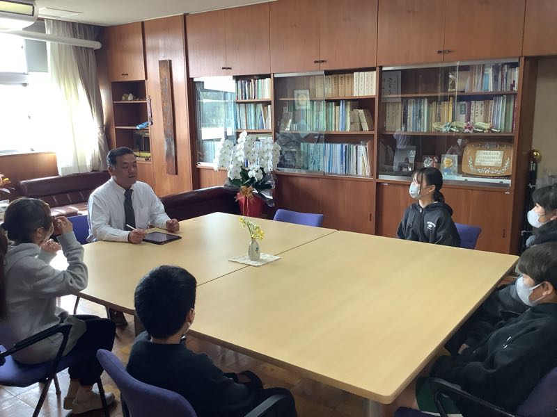 6年生が5人程度のグループで連日、校長先生と語る会を行なっています。小学校での思い出や中学生になったらどの部活動に入りたいかなど様々な話題で、普段ゆっくり話ができない校長先生と語り合って思い出を作っています。