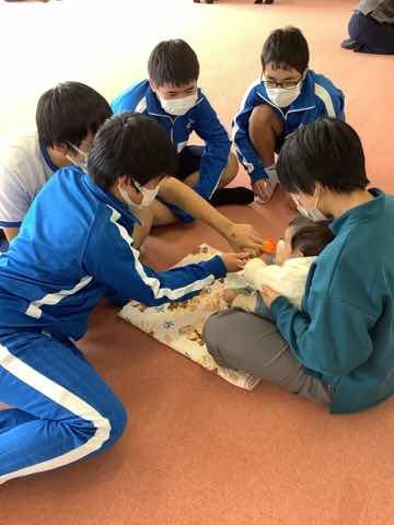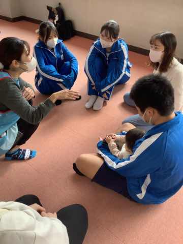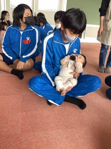 先日、3年C組が赤ちゃんふれあい交流会を行いました。4か月の赤ちゃんを抱っこさせてもらった生徒は、「わーかわいい!こんなに小さいんだ!」と赤ちゃんの小ささとかわいさに驚いていました。お風呂の入れ方や、離乳食のあげ方、夜泣きの対応など育児の大変さを直接聞くことができ、とても貴重な体験となりました。また、参加されたお母さんたちは、パートナーの役割についても話して下さり、性別関係なく、一緒に子どもを育てることが大切だと教えて頂きました。
