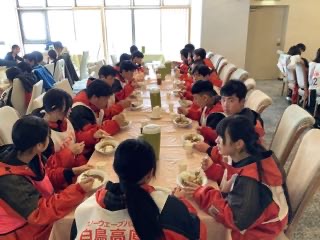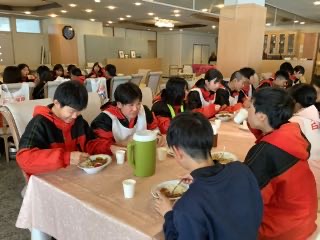 2日目のランチはカレーライス。東中生がグループごとに集まっていただきました。午前中のスキーでお腹もペコペコ。どのグループも笑顔いっぱいで、元気に食事を楽しんでいました。午後のレッスンも、この明るい雰囲気のまま頑張っていきます。