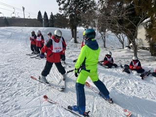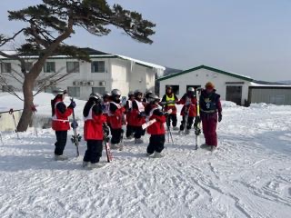 スキーレッスンが進む中、子どもたちはインストラクターの方のお話を真剣に聞いています。その表情には笑顔もあふれ、ゲレンデにはとてもよい雰囲気が広がっています。