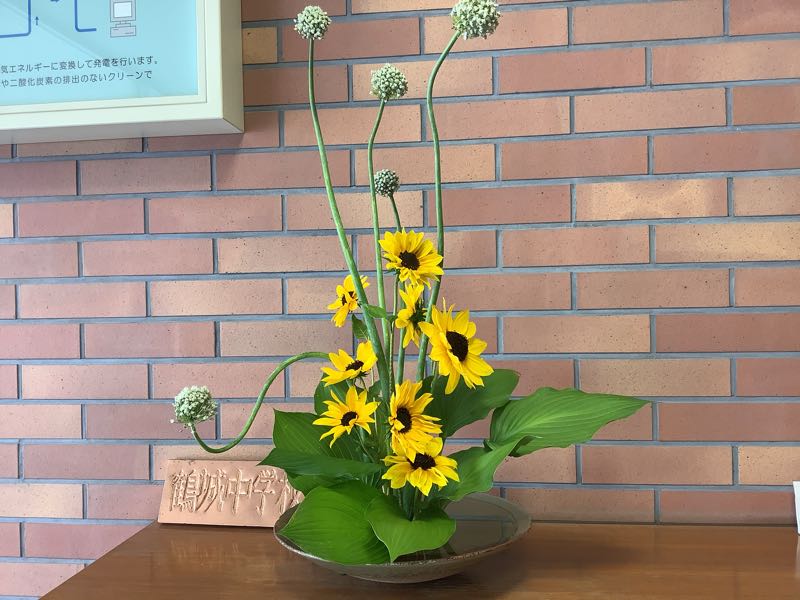 今週の生け花は、タマネギボウズ、ヒマワリ、ギボウシです。夏の花、ヒマワリの登場です。