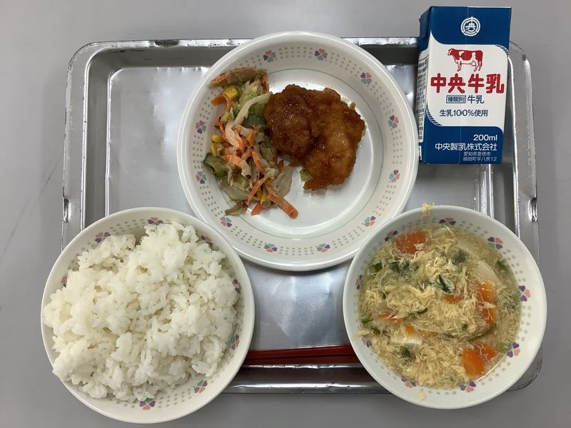 今日のメニューは、ご飯、牛乳、揚げ鶏のレモンソース、和風アーモンドサラダ、かきたま汁です。