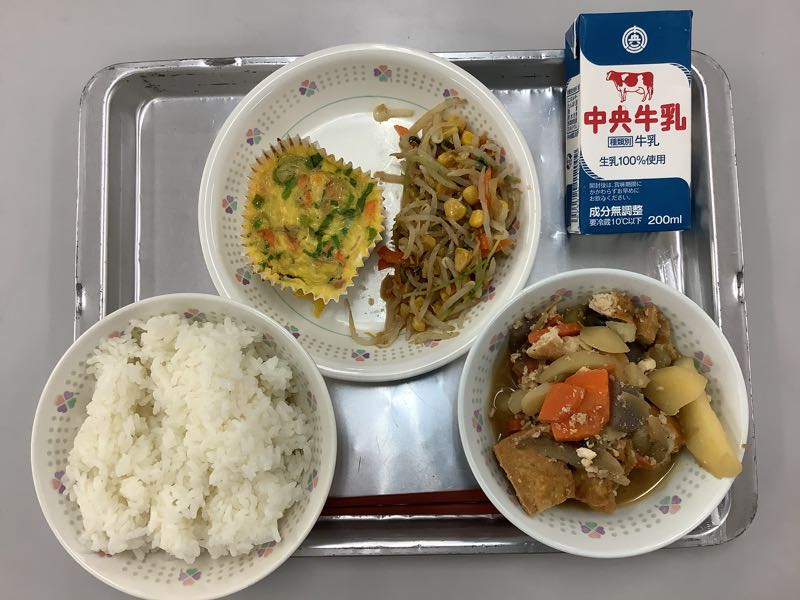 今日のメニューは、ご飯、牛乳、ねぎとしらすの卵焼き、もやしと切干大根の和え物、野菜の旨煮です。