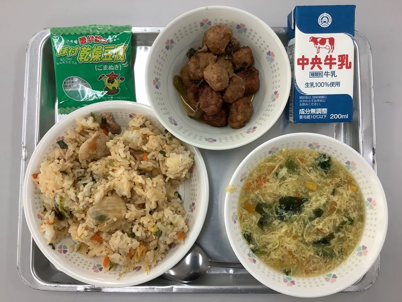 今日のメニューは、キムチチャーハン、牛乳、カリカリ豆腐、肉団子の野菜あんかけ、華風コーンスープです。
