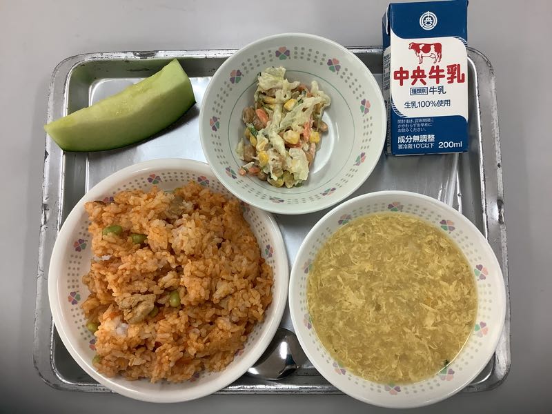 今日のメニューは、チキンライス、牛乳、メロン、大豆サラダ、たまごコーンスープです。