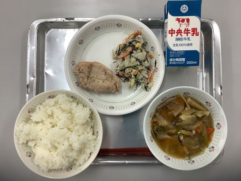 今日のメニューは、ご飯、牛乳、鶏肉のごまドレッシング焼き、ひじきサラダ、けんちん汁です。