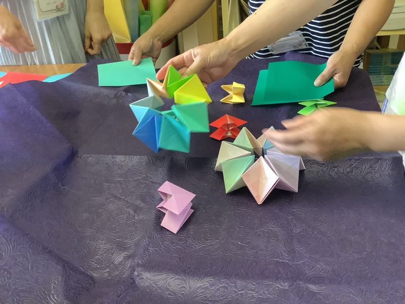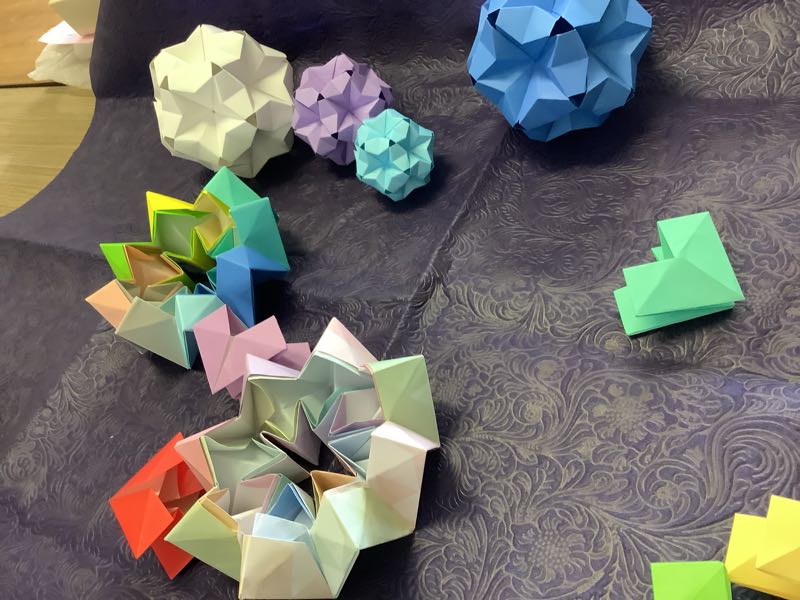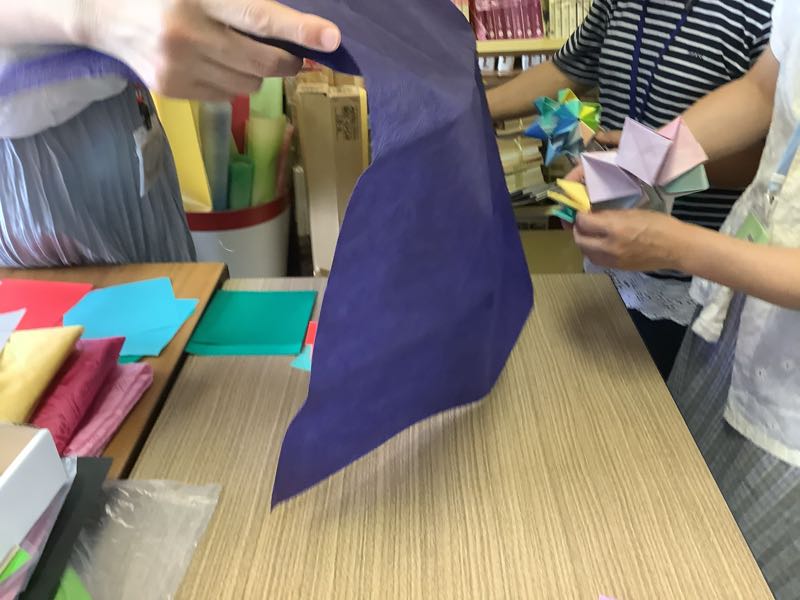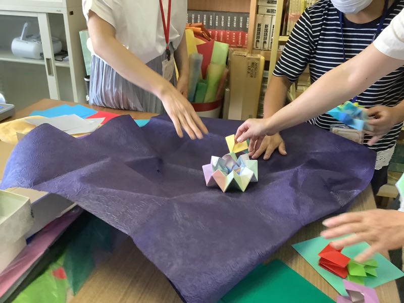 湿度が明らかに高く、じめじめする天気でした。図書準備室に3人の図書館ボランティアさんが集まって、楽しそうにお話をされながら図書館掲示を作ってくださいました。折り紙でくるくる回して遊べる万華鏡みたいな「無限ループ」が次々に現れました。下に敷く不織布は何色がいいか試行錯誤していらっしゃいました。展示が楽しみです。