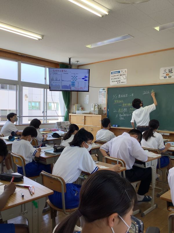 ディスプレイにグラフや資料や、写真が大きく映し出されます。2年5組、社会の授業では「日本の工業」について学習しました。工業の国際化を考えると課題が見えてきました。