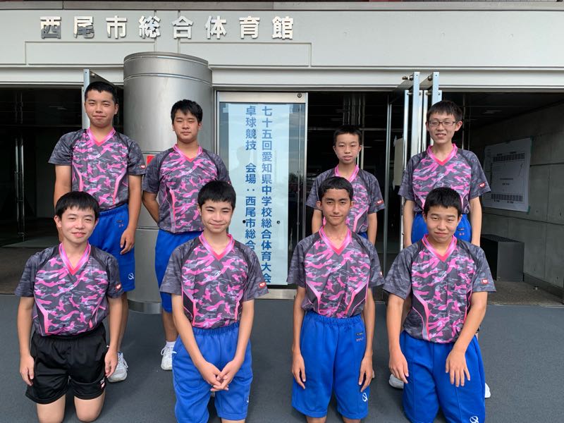卓球部男子の県大会の結果はベスト8となりました。一次リーグでは、藤浪中学校と豊国中学校に勝利しましたが、冨貴中学校に3-2で惜敗し、 2位で通過しました。2次リーグでは神丘中学校と矢作北中学校にあと一歩のところで負け、ベスト8という結果になりました。東海大会に出場することはできませんでしたが、最後まで戦いきった卓球部男子の姿に成長を感じました。これで、3年生は全員引退になりますが、学校生活での活躍も期待しています。お疲れ様でした。