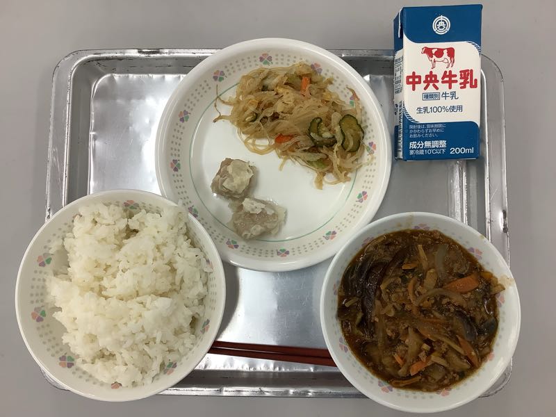 今日のメニューは、ご飯、牛乳、マーボーなす、しゅうまい、中華サラダです。