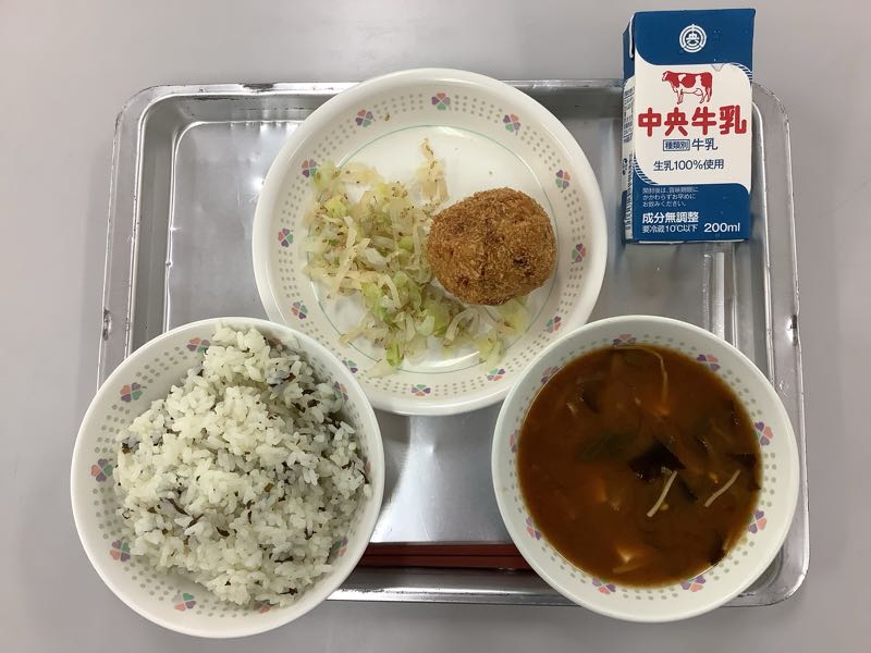 今日のメニューは、わかめ飯、牛乳、かぼちゃコロッケ、たくあん和え、切干大根のみそ汁です。