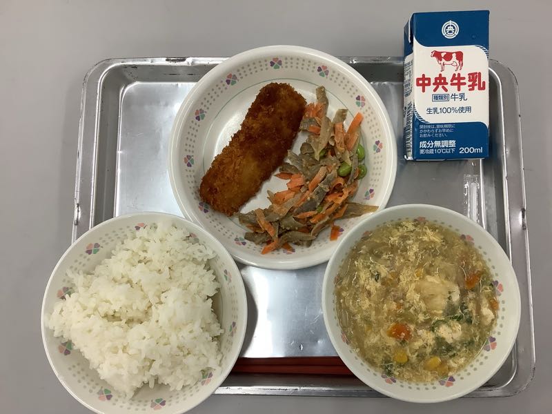 今日のメニューは、ご飯、牛乳、いかフライのレモン煮、ごぼうと枝豆のサラダ、とうがん入り卵スープです。