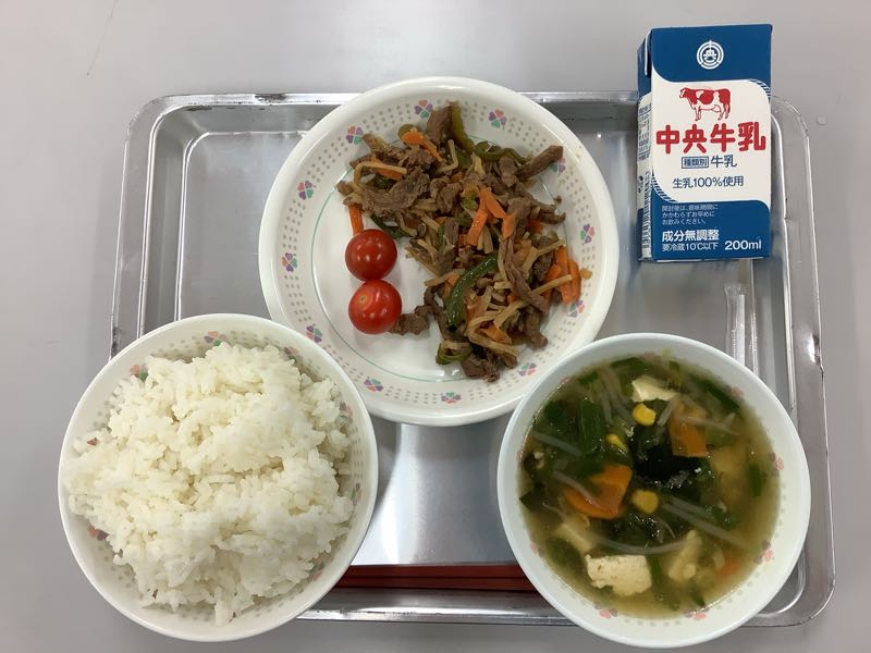 今日のメニューは、ご飯、牛乳、チンジャオロースー、ミニトマト、わかめ中華スープです。