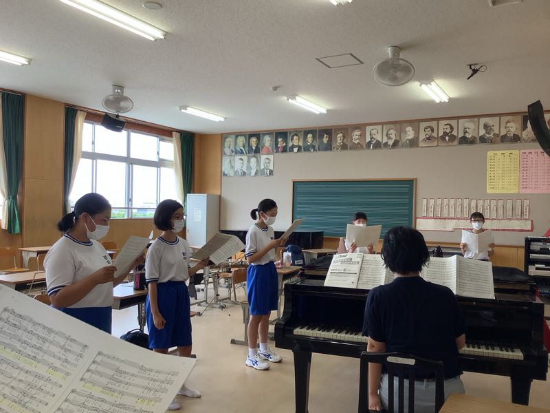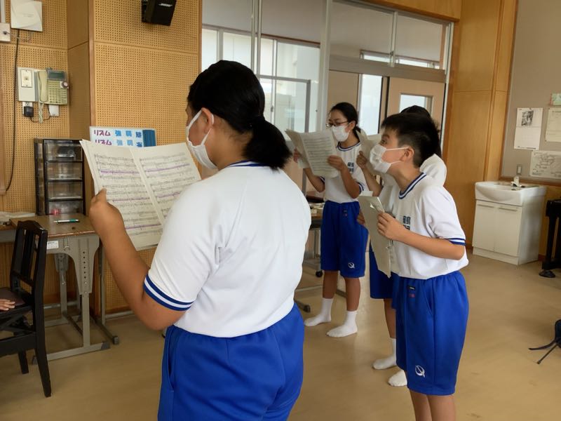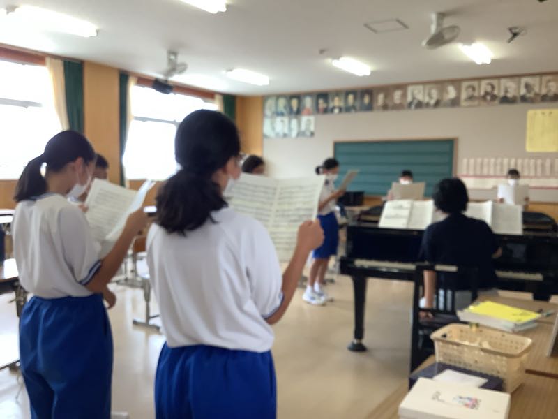まど みちお作詞の「お ん が く」を夏休み中に練習しているコーラス部です。🎵神様だったら「音楽」が見えるのかしら🎶という歌詞から、心で音楽を感じたらこんなふうに歌うのかな🎶とイメージしながら発声しています。