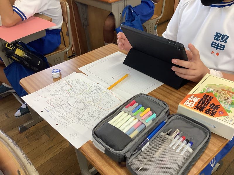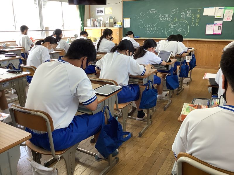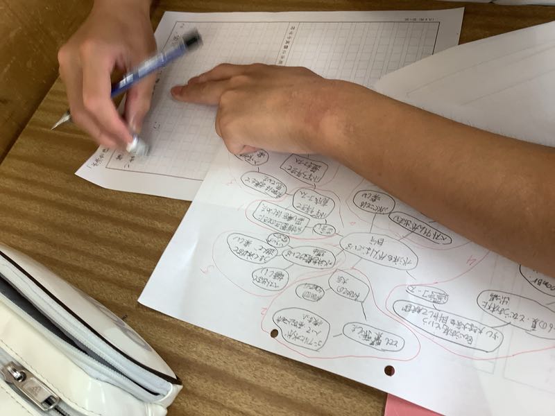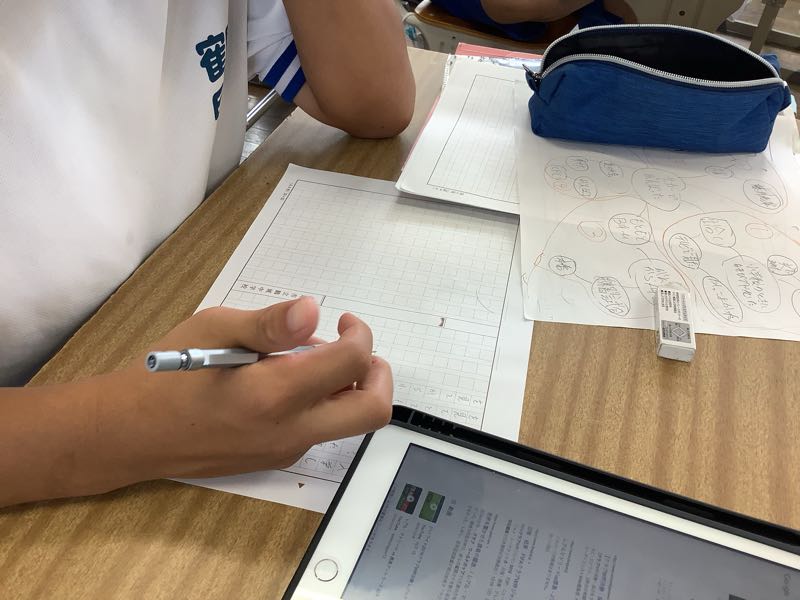夏休み前に作文、感想文、詩を書いています。2年4組の生徒は10日間、考えて絞った作文のネタを白紙にウェビングで書いてみました。次に構想表を作っていると、書きたいことがはっきりとしてきました。教室中でシャープを動かす音だけ響いていました。