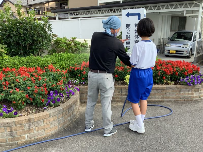 連日34度に迫る気温に、鶴中の緑たちもたっぷりと水を欲しがっています。緑化委員たちは、毎日当番を忘れずに来校し、水かけをしています。7月30日は1年生が正門のサルビアたちに時間をかけてたっぷりと水かけをしていました。ありがとう😊