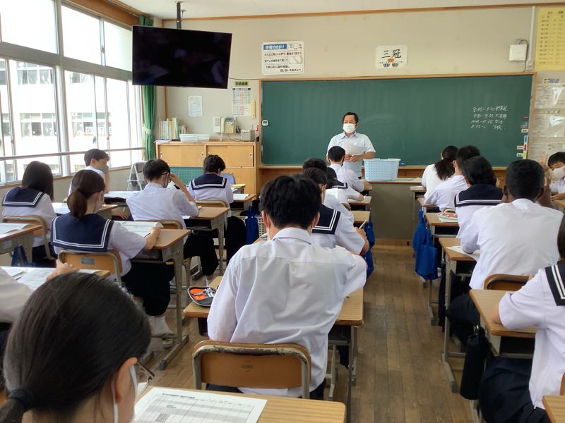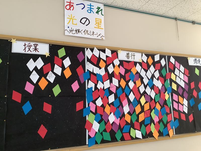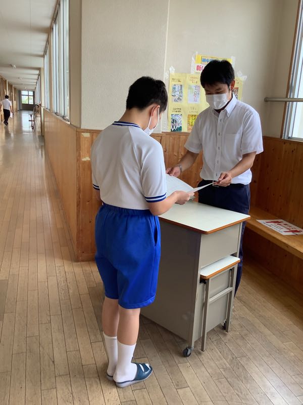 7月20日、1学期終業式が体育館で行われました。2年代表生徒は、進んで自分がクラスの仲間のために動ける人になったと語りました。「あつまれ光の星」を計画して、クラスカラーを掲示に活かすことも提案しました。(今、表情コーナーはとてもカラフルです。善行をする友達を見つけ、挨拶の素晴らしい友を知り、授業で活躍する友を讃えています。)学活では担任と面談して、通知表を受け取り、教科を振り返りました。充実した1学期を締めくくることができました。