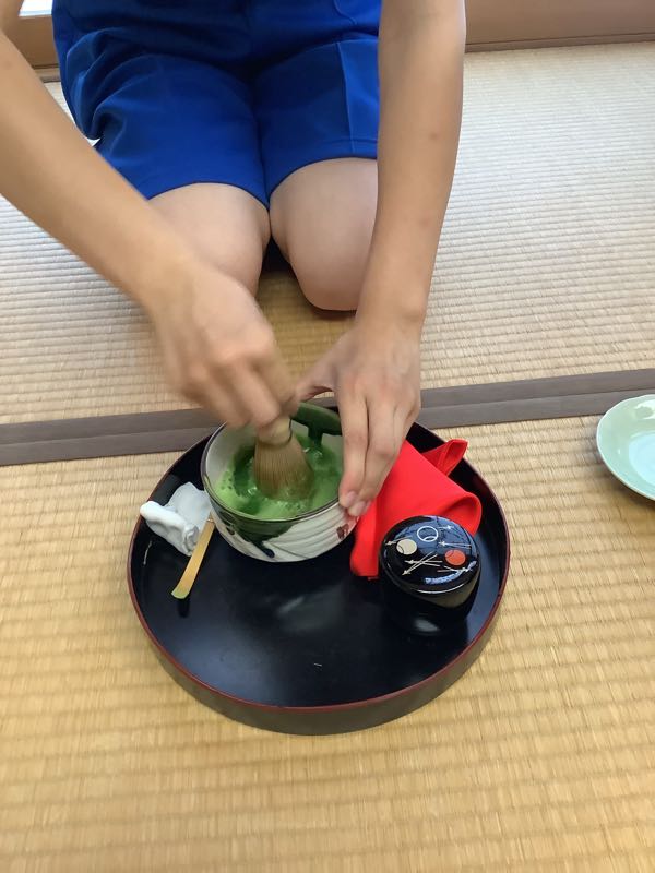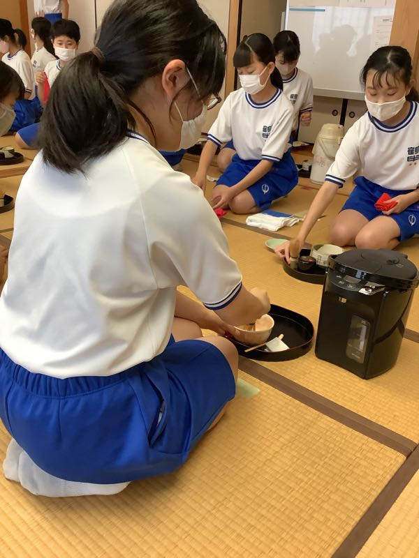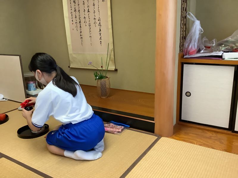 今日のお花は🌸千日房とすすきです。お菓子は五家宝で、30人が手際よく支度をします。茶道の先生と先輩が教えてくださって1年生もお点前が上手くなりました。