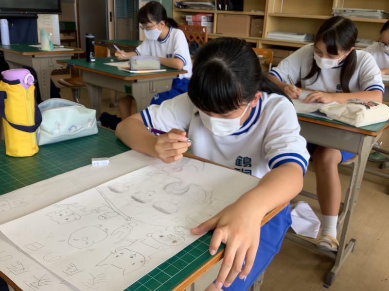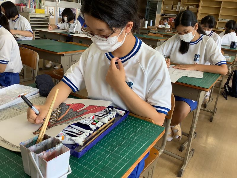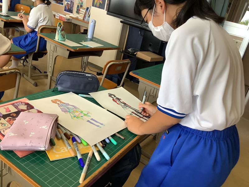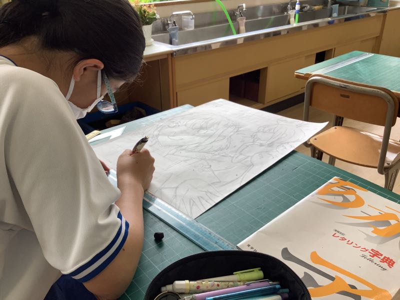 応募作品に一生懸命に取り組んでいる美術部です。ファッションイラスト画コンテストに、燃えています。自分の着たいファッションを考え、どんなポーズで決めるかも悩み、描き直しを繰り返しています。また、交通安全ポスターやいじめ防止ポスター等、好きなテーマを選ぶことから悩みながら、描いていきます。