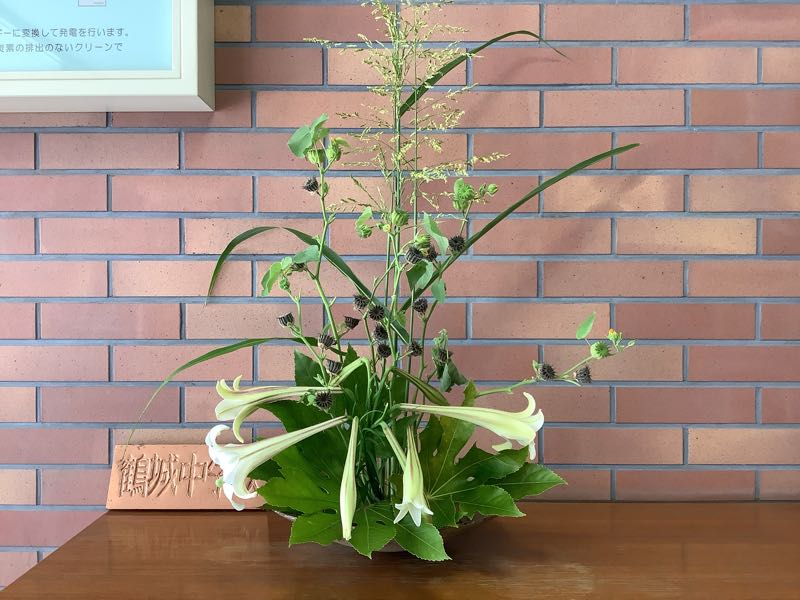 今週の生け花は、アブラススキ、ヤツデ、タカサゴユリです。暦の上では、立秋を過ぎて秋の気配が立ち始まるころですが、まだまだ暑い日は続くようです。