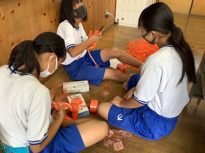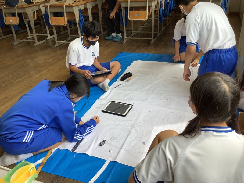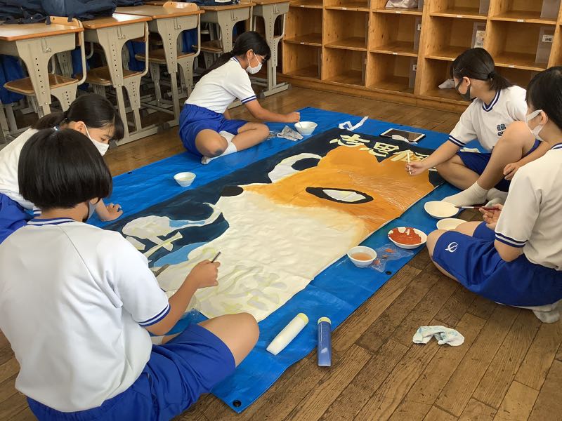 先週末から応援旗を制作しています。応援旗メンバーはイラスト、構成、文字の工夫など考えることがいろいろあり、意見をすり合わせて、作成しています。2年7組は彩色に進みました。下絵に凝っているクラスも楽しんで描いていました。