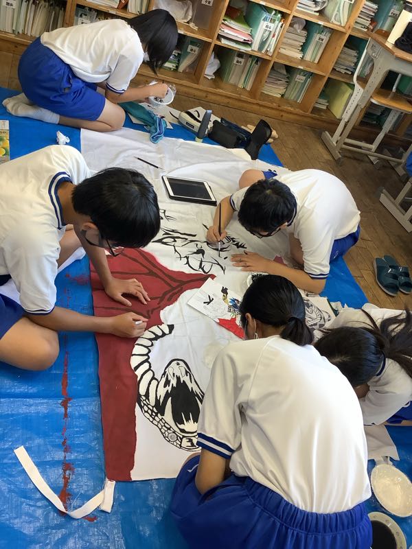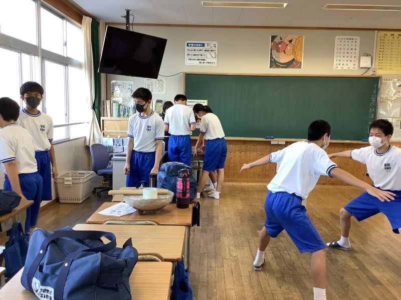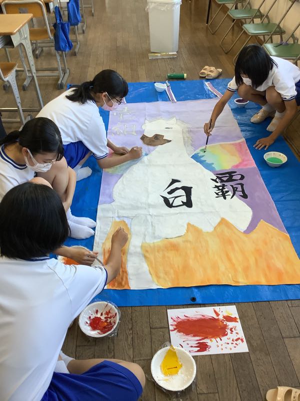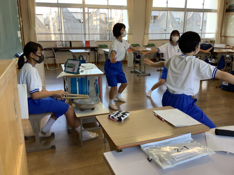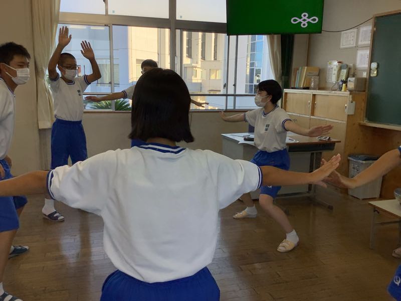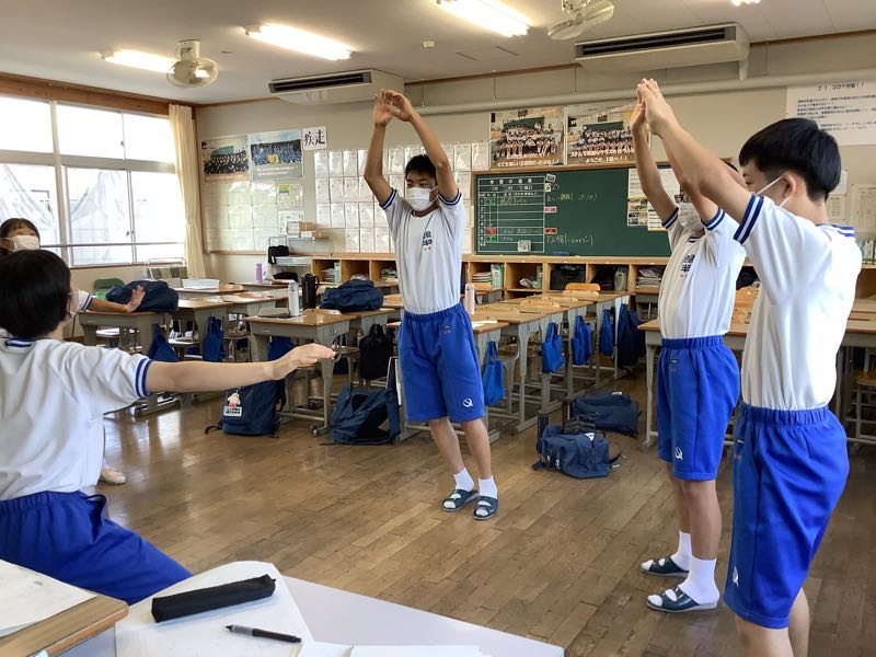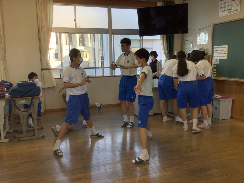 体育大会を10月に控え、応援合戦の練習を再開しています。なんと1か月程空白があります。2年1組、2組は団長、団員の声かけも上手く、ブランクを感じさせません。演技練習はどんどん進んでいました。