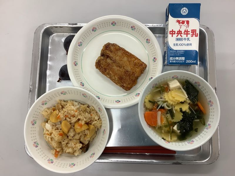 今日のメニューは、栗ご飯、牛乳、巨峰、さんまの蒲焼き風煮、豆腐汁です。