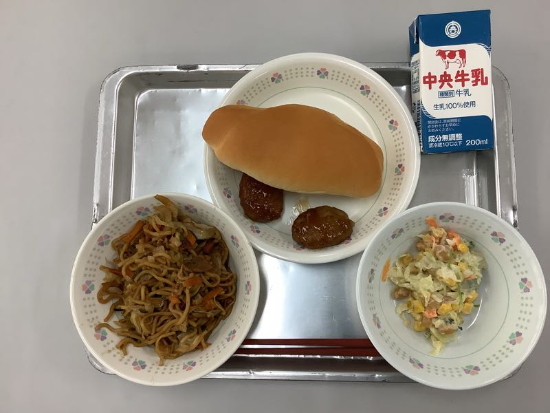 今日のメニューは、小型ロールパン、牛乳、大豆サラダ、肉焼きそば、白ごまつくねです。