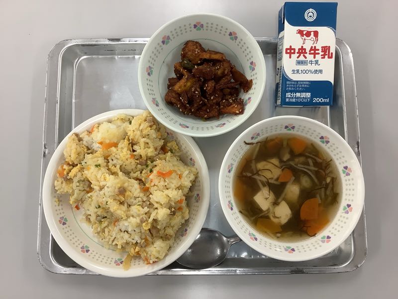 今日のメニューは、チャーハン、牛乳、鶏肉のごまみそがらめ、もずく入り酸辣湯スープです。酸辣湯は、中華料理のスープのひとつです。酢の酸味と唐辛子や胡椒の辛味と香味を利かせた、酸味豊かな辛みのあるスープです。