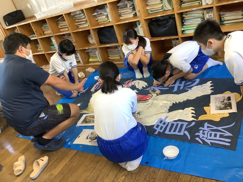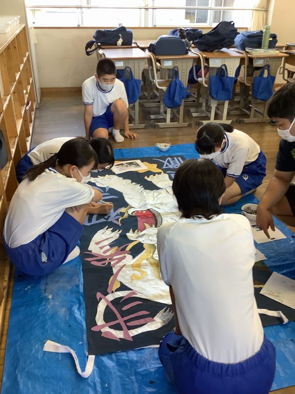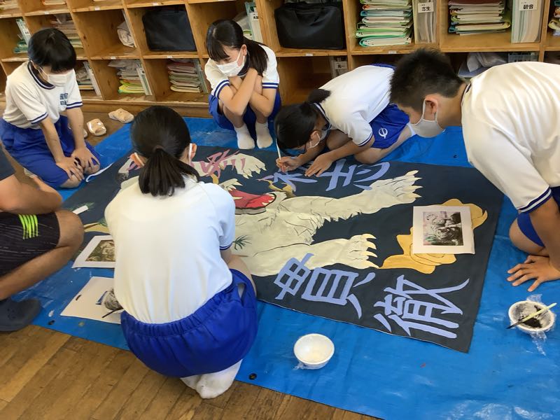 2年3組の団長は「今日は2分の流れを通してできるようにする。115分の練習を有効にやろうね。ラストの3グループ分けの演技をしっかりね」と話していました。旗メンバーは大胆なイラストをいっそうパワーアップさせて描いていました。