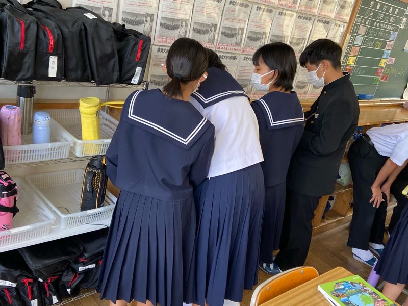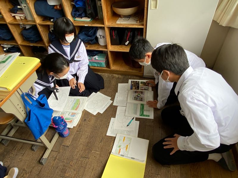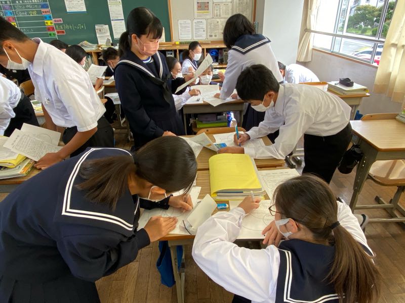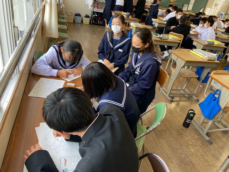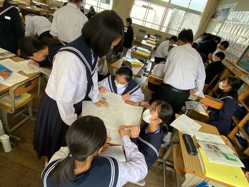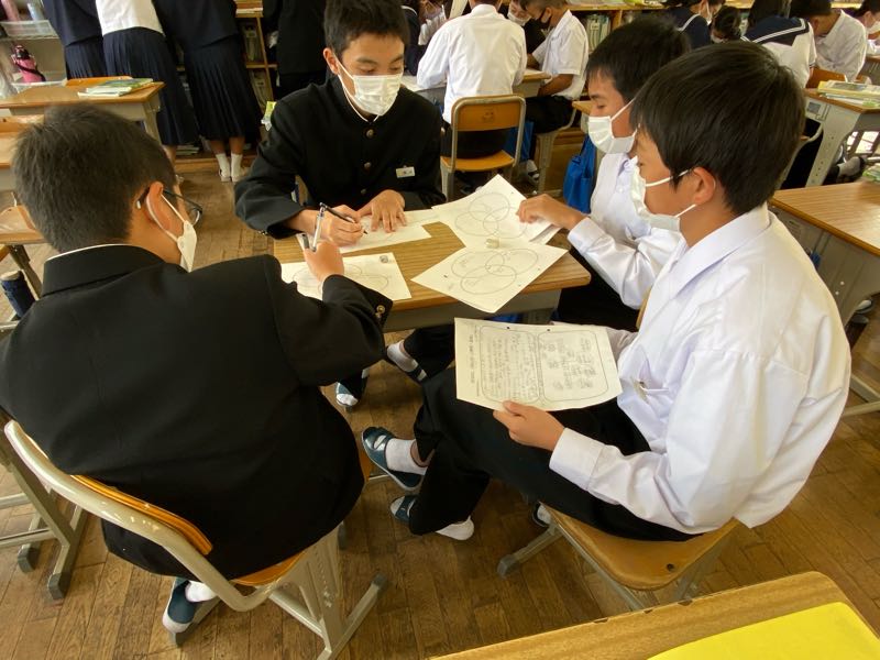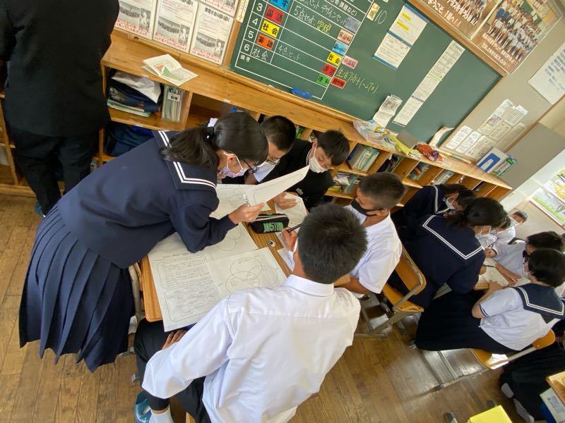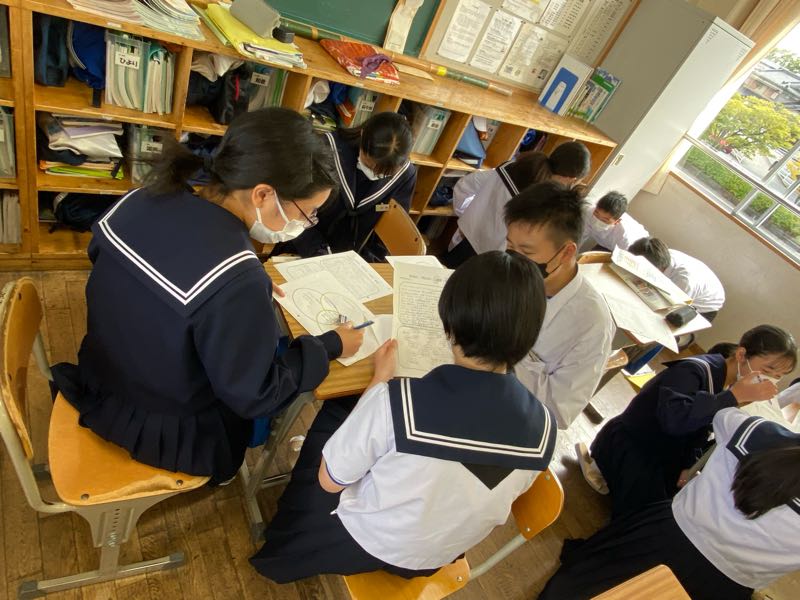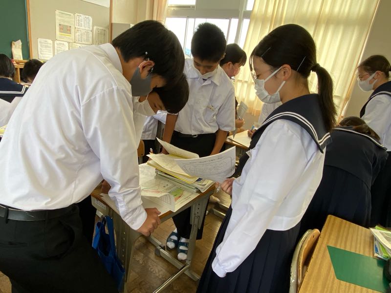 明日の6時間目が研究授業ということで、今日は岡山市、徳島県上勝町、香川県直島町の街づくりを資料から読み取り、それぞれの町づくりの共通点や独自の取り組みなどを話し合い活動で見つけ出しました!! 話し合い活動のグループ編成も生徒自身に任せ、より主体的に、より活発に行えるようにしています。話し合う場所や進め方も生徒自身がやりやすいようにやっています。 明日の研究授業では、新たな課題に取り組み、より活発な話し合い活動や1組のがんばる姿が見れたらと思います!