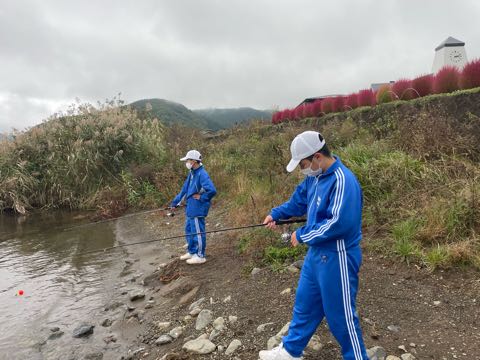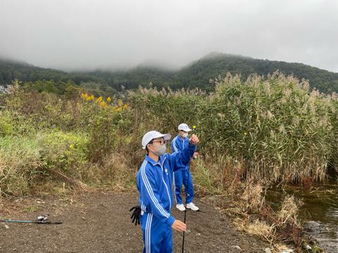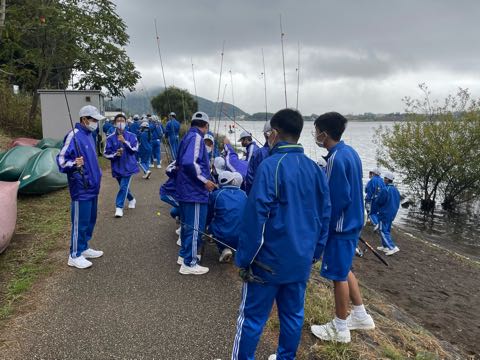 河口湖でのフィッシング体験、生徒たちはブラックバス目指して釣り竿を握りしめます。気温が低く難しい環境の中、4人の生徒が10cm以上の魚を釣ってインストラクターさんに認めてもらいました!