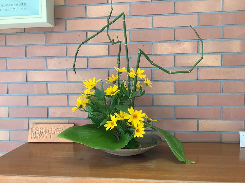 今週の生け花は、トクサ、キクイモ、オオバギボシです。中央の黄色い花が、キクイモです。草丈が⒈5〜3mと大きくなり、菊に似た黄色い花を9〜10月につけ、10月末に地中に塊茎を作ります。