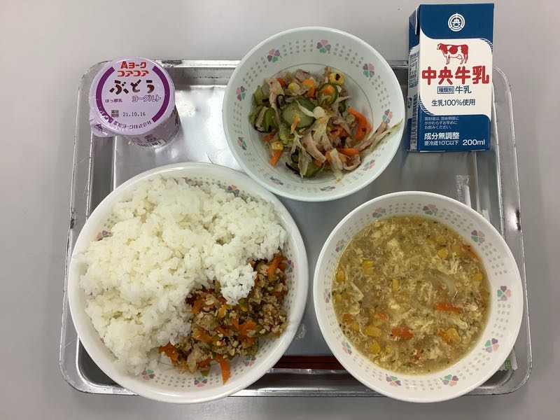 今日のメニューは、ガパオライス、牛乳、元気サラダ、たまごコーンスープ、ぶどうヨーグルトです。