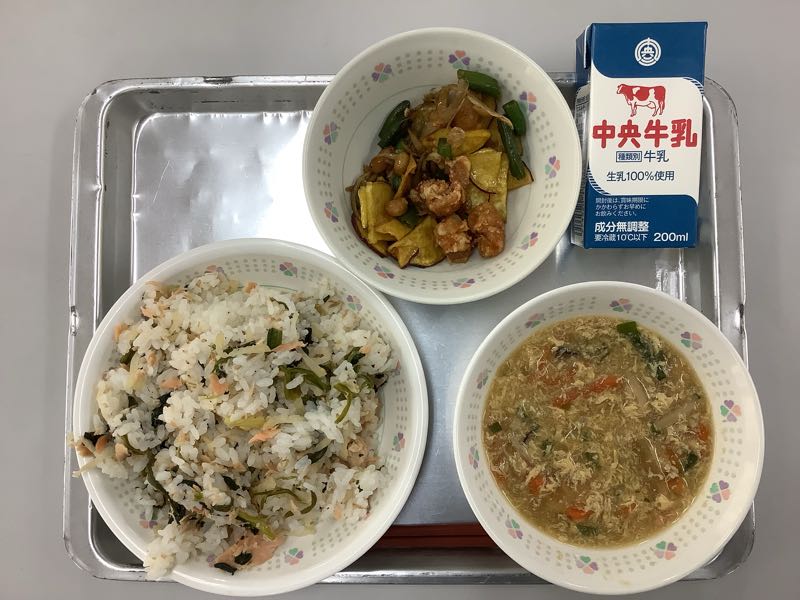 今日のメニューは、秋鮭ちらし寿司、牛乳、秋野菜の揚げ煮、きのこのかきたま汁です。