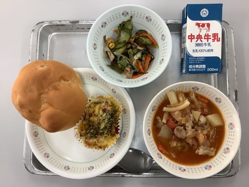 今日のメニューは、リンゴパン、牛乳、さつまいもとかぼちゃのチーズ焼き、ハムと海藻のサラダ、秋野菜のミネストローネです。