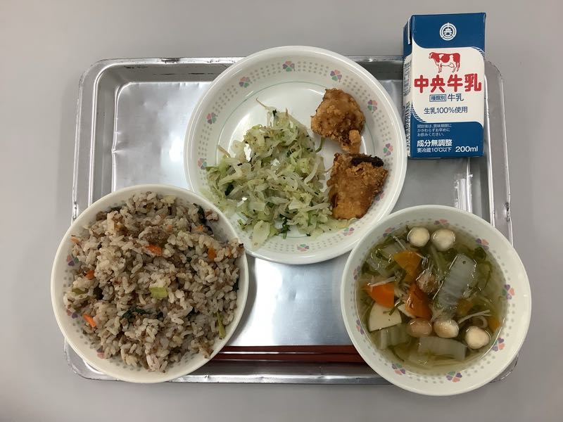 今日のメニューは、ひき肉と小松菜の混ぜご飯、牛乳、魚の唐揚げ、青菜和え、玉麩のすまし汁です。