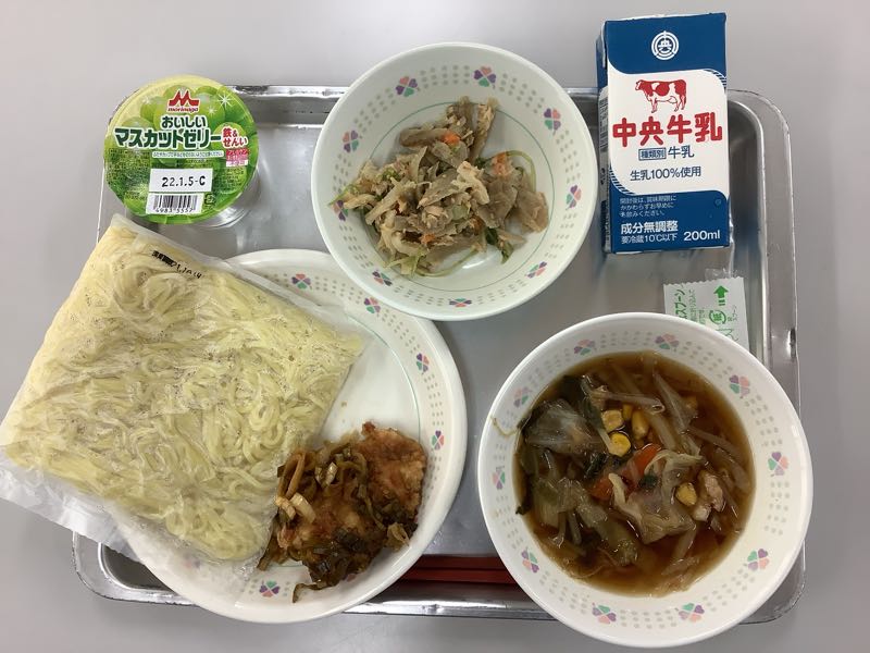 今日のメニューは、五目ラーメン、牛乳、鶏肉の香味だれかけ、切干大根シャキシャキサラダ、マスカットゼリーです。