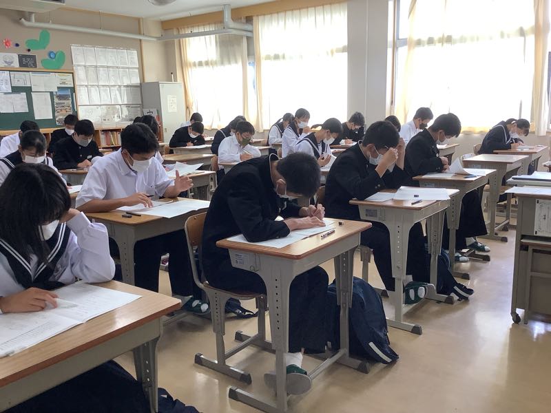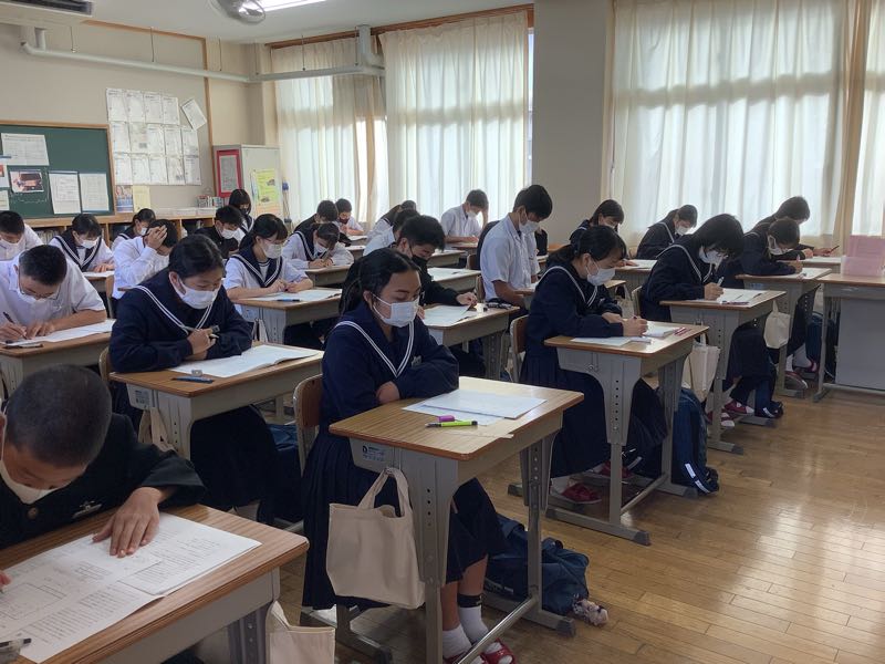 先週末、コロナで延期になった体育大会も無事に終了し、今日は3年生にとっては大切な学力テストです。国語・数学・社会・理科・英語の5教科で、多くの入試と同じように実施です。体育大会明けの疲れも見せず、解答用紙に向かっていました。
