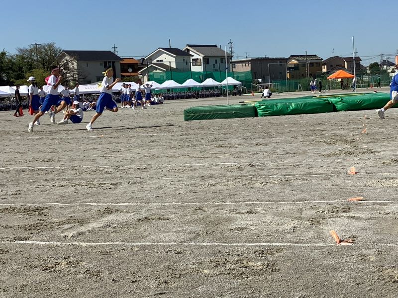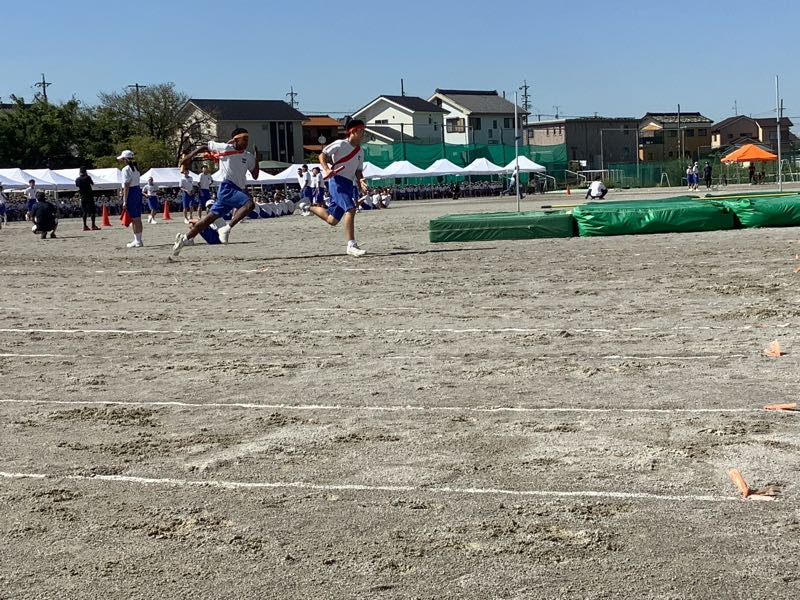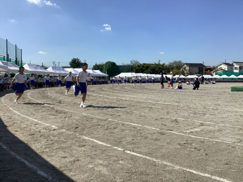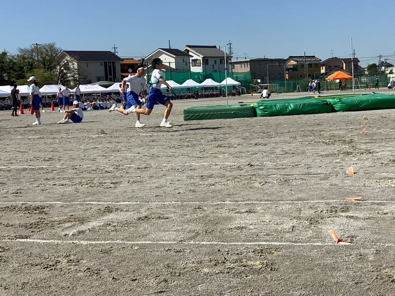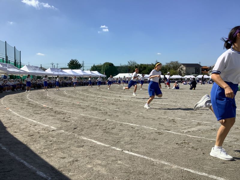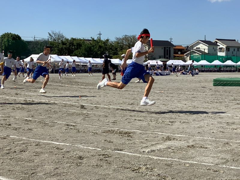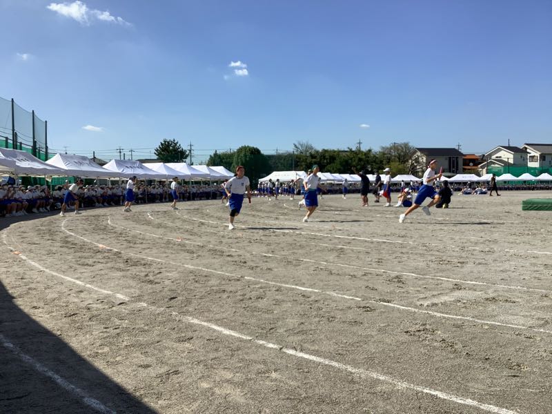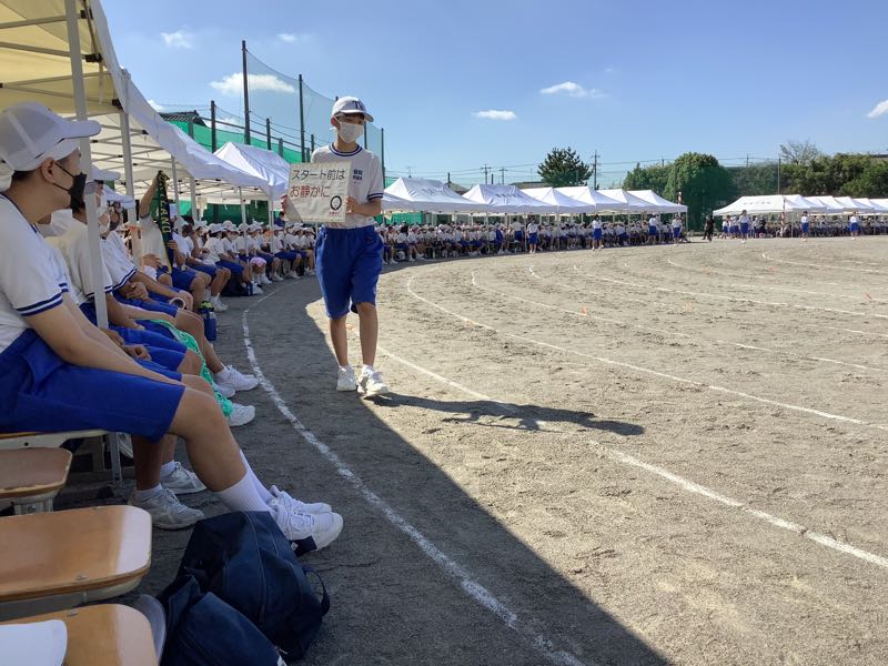 体育大会では各係できちんと役割を果たす2年生です。陸上競技は緊張感と高揚感ある中で、粛々と進んでいきました。本日最後の競技、選抜リレーがまもなく始まります。全校が見守る中、シーンとした静けさ。選抜リレー2年生の全力疾走。