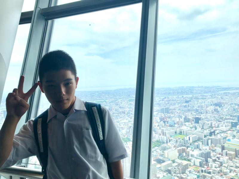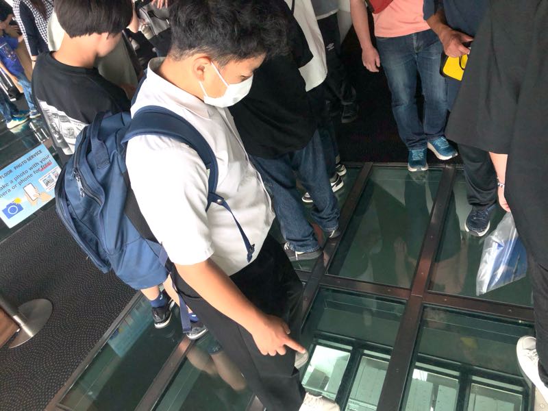 修学旅行3日目、高さ634mのスカイツリーに行きました。東京タワーや数々のビル、東京に流れる川など、450mの高さから見える東京の街は、壮観でした!また、高さ350mのガラス床にも挑戦しました!