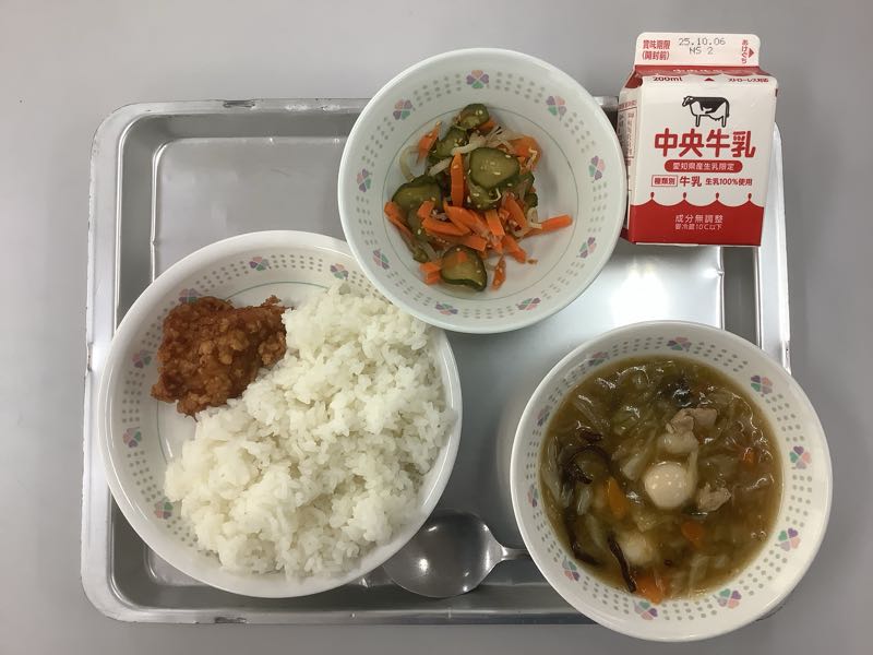 今日のメニューは、中華飯、牛乳、手作り鶏肉の唐揚げ、きゅうりともやしの中華あえです。(867kcal)