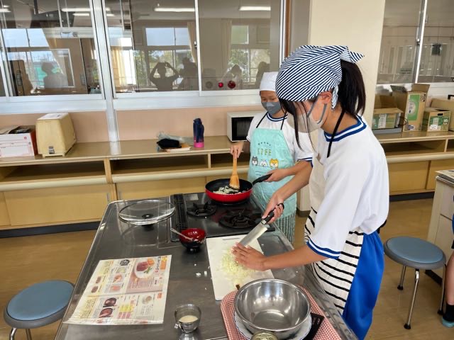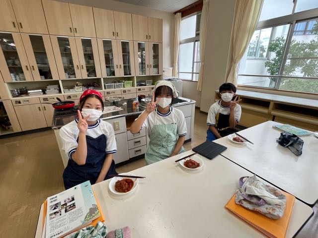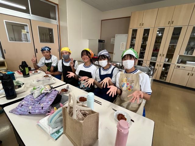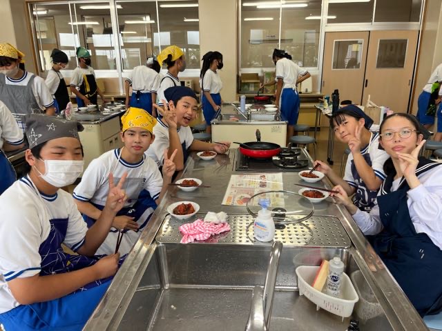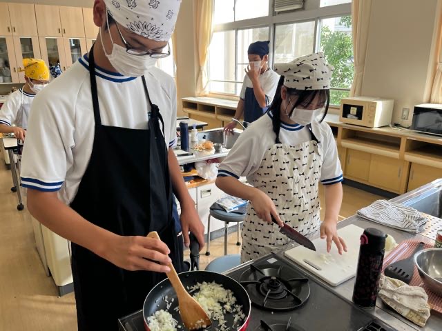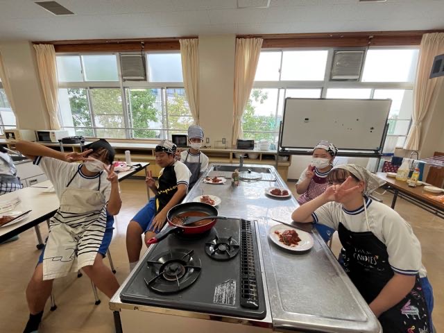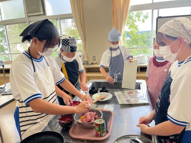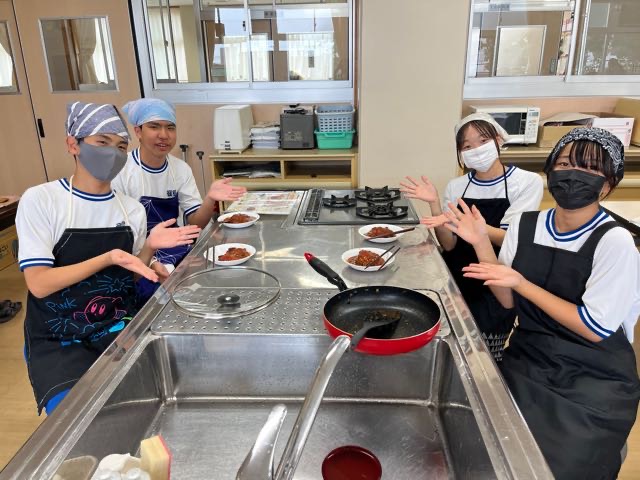 2-8の調理実習の様子です。手際の良さとチームワークでハンバーグを美味しく作ることができました!