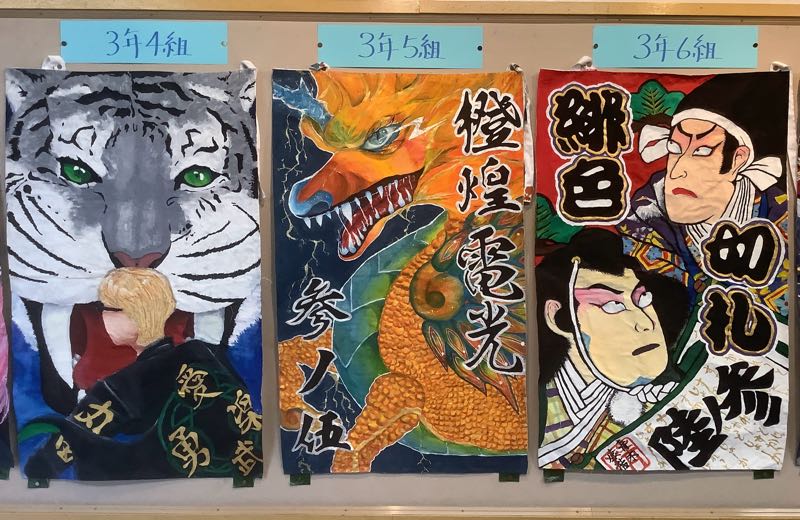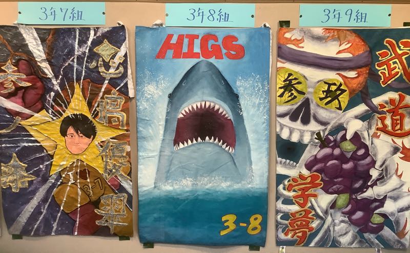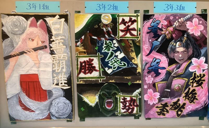 完成した3年生の応援団旗が、西校舎1回表現コーナーに飾られています。どのクラスも力作揃いです。