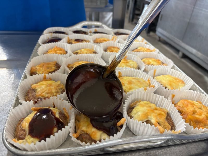 チーズのせハンバーグは前期の委員会でとった給食についてのアンケートの食べてみたい献立上位のメニューです。ハンバーグにチーズをかけてオーブンで焼き、みんなが好きなデミグラスソースを上からかけました。