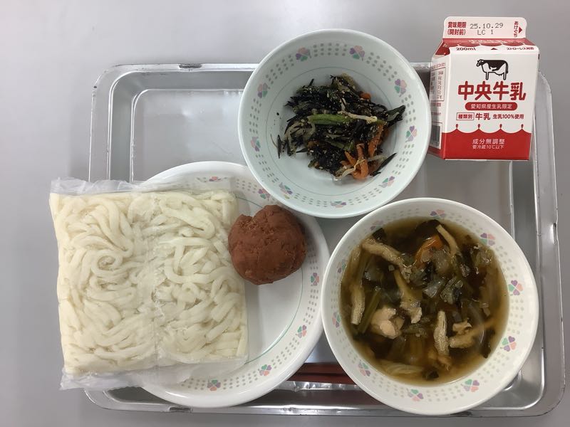 今日のメニューは、白玉うどん、牛乳、きつねうどん、千草あえ、手作り黒糖いもドーナツです。(838kcal)