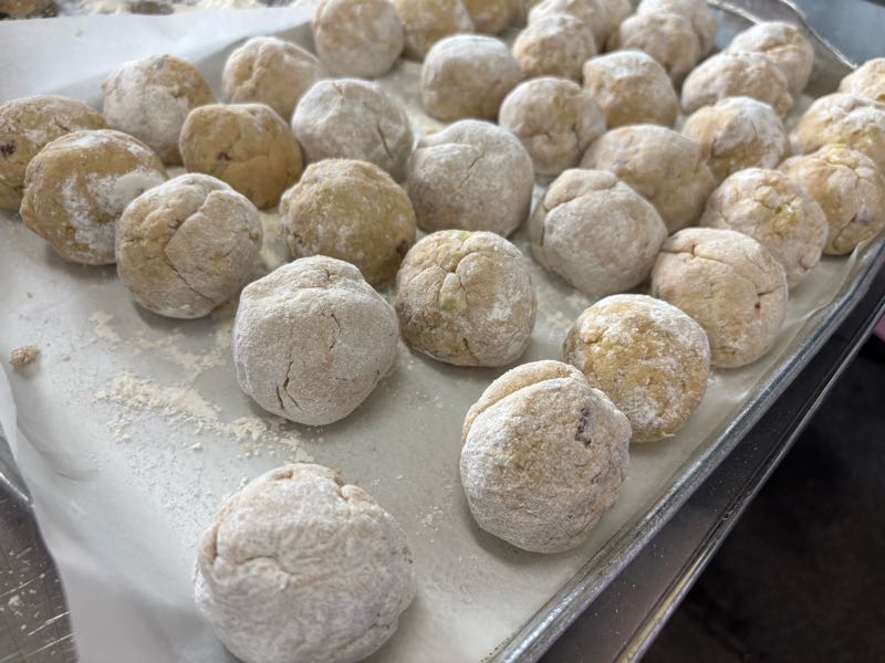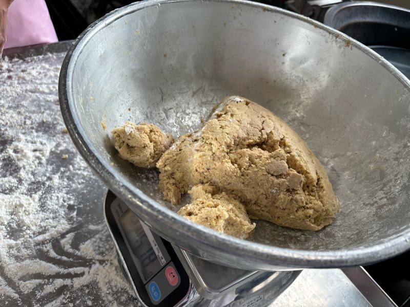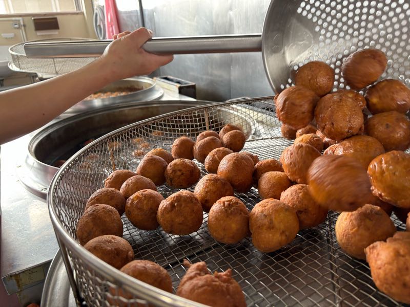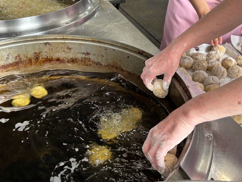 黒糖いもドーナツは調理場で手作りしています。黒砂糖の原材料は白砂糖と同じ「さとうきび」です。黒砂糖はさとうきびから絞った汁をそのまま煮詰めて、冷やして固めて作られる黒褐色の砂糖です。一方、白砂糖は、さとうきび(もしくはてん茶)から絞った汁を煮詰めて、不純物を取り除き、何度も精製するために透き通るようなきれいな白色をした砂糖になります。