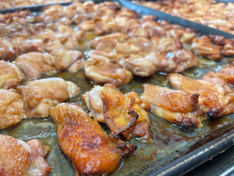 今日のメニューは、ご飯、牛乳、ガイヤーン、ヤム・ウンセン、トムヤムクン風スープ、ライチゼリーです。(796kcal)