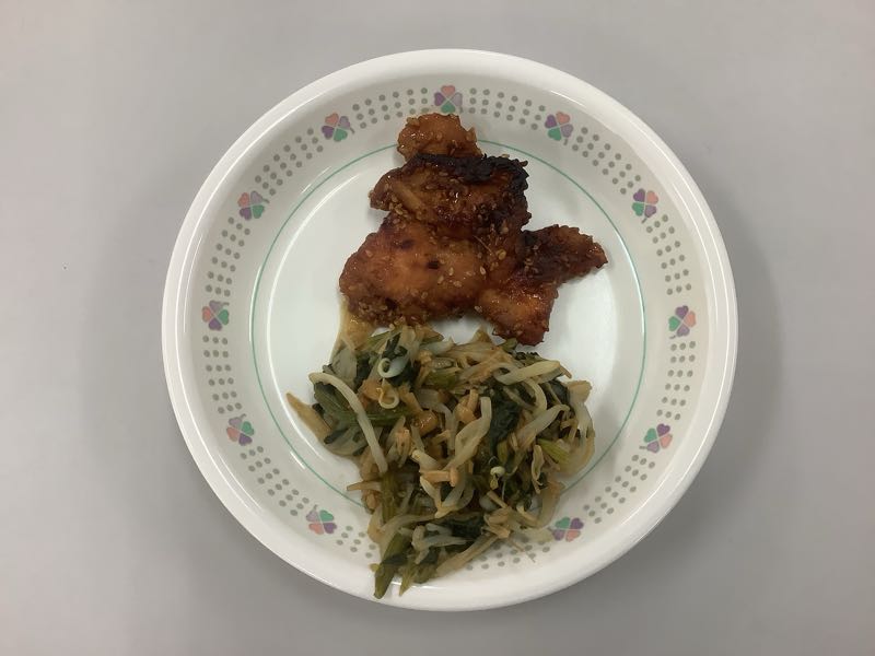 今日のメニューは、ご飯、牛乳、鶏肉のごまみそ焼き、野菜のなめ茸からしあえ、じゃがいものそぼろ煮です。(825kcal)