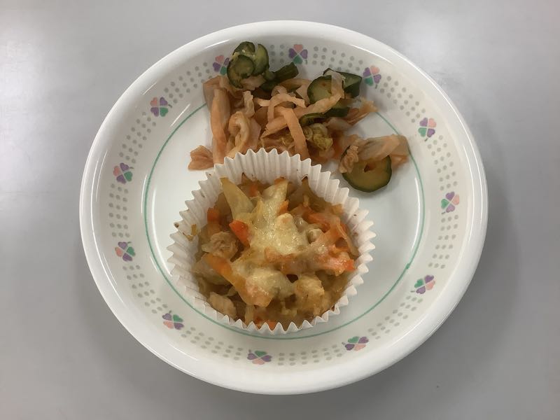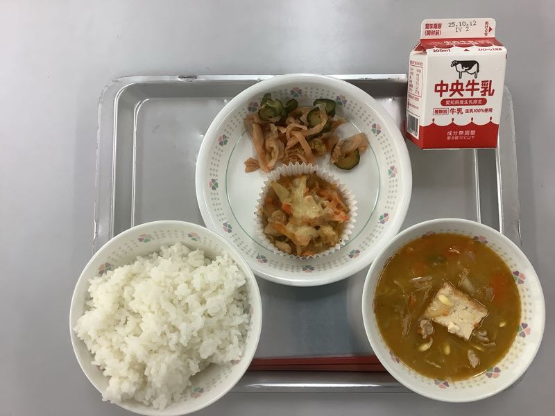 今日のメニューは、ご飯、牛乳、チーズタッカルビ、キムチあえ、みそチゲ煮です。(755kcal)